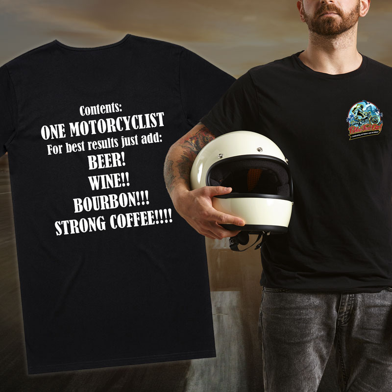 Commemorate your Bike Fest Oz! experience with an official T-Shirt. Black T with BFO! logo on the front and slogan on the back.